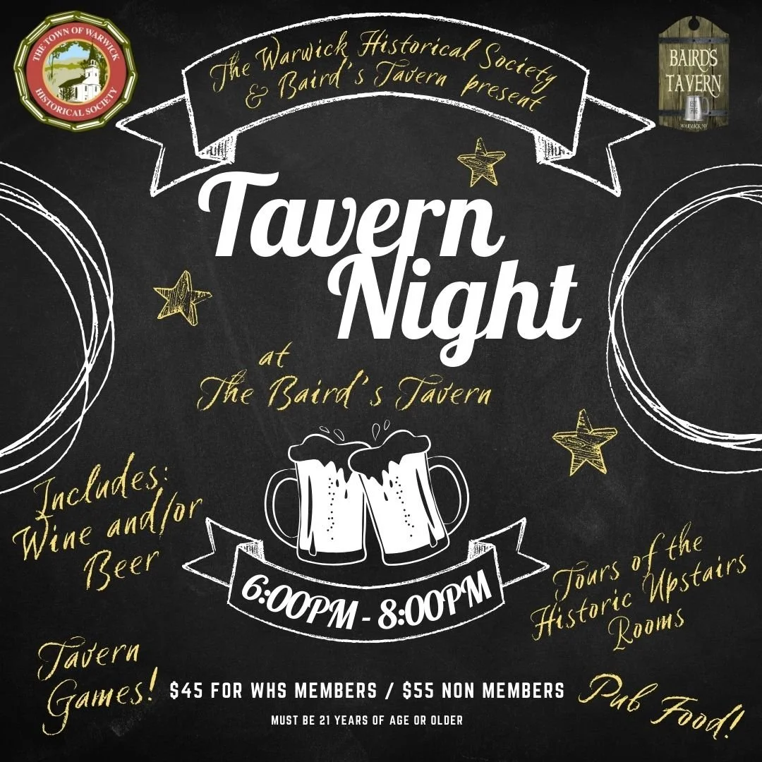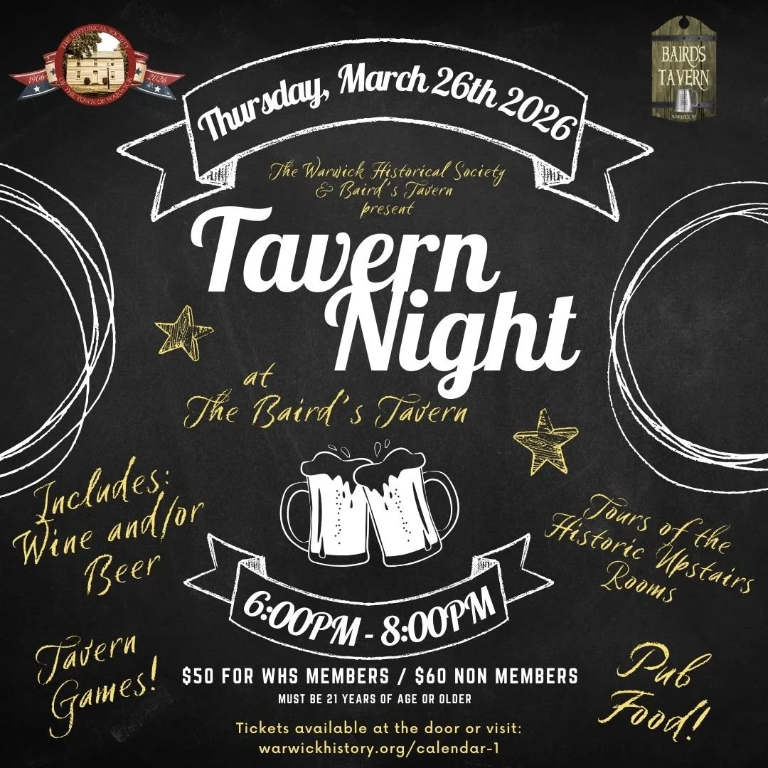 Every March, The Warwick Historical Society holds its annual Tavern Night. It’s an unforgettable evening Baird’s Tavern delighting in libations and delectable food surrounded by a cozy tavern ambiance.