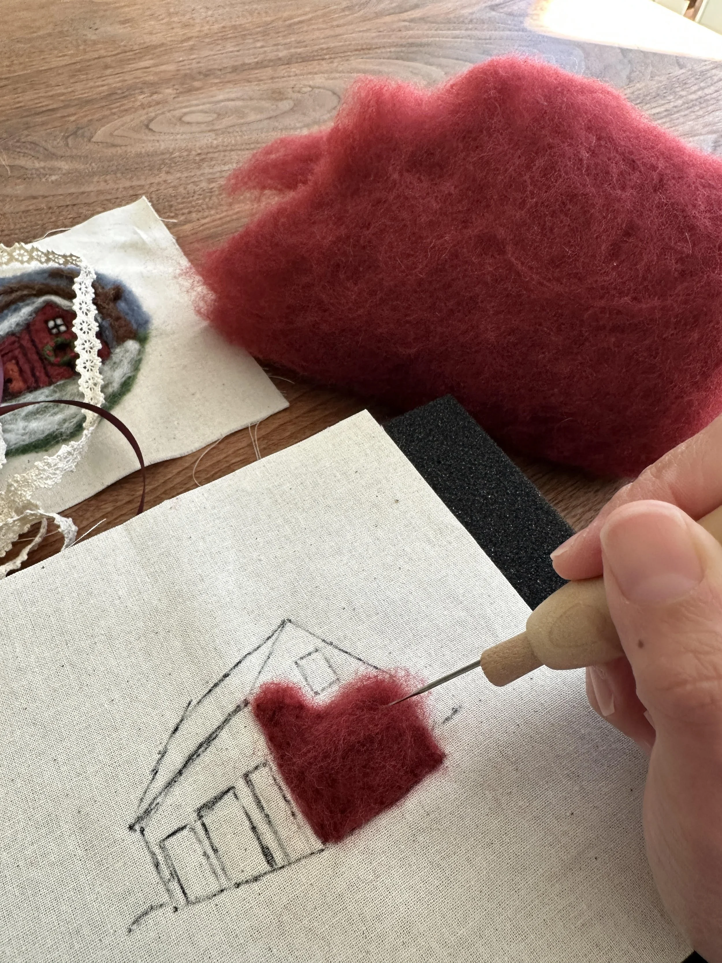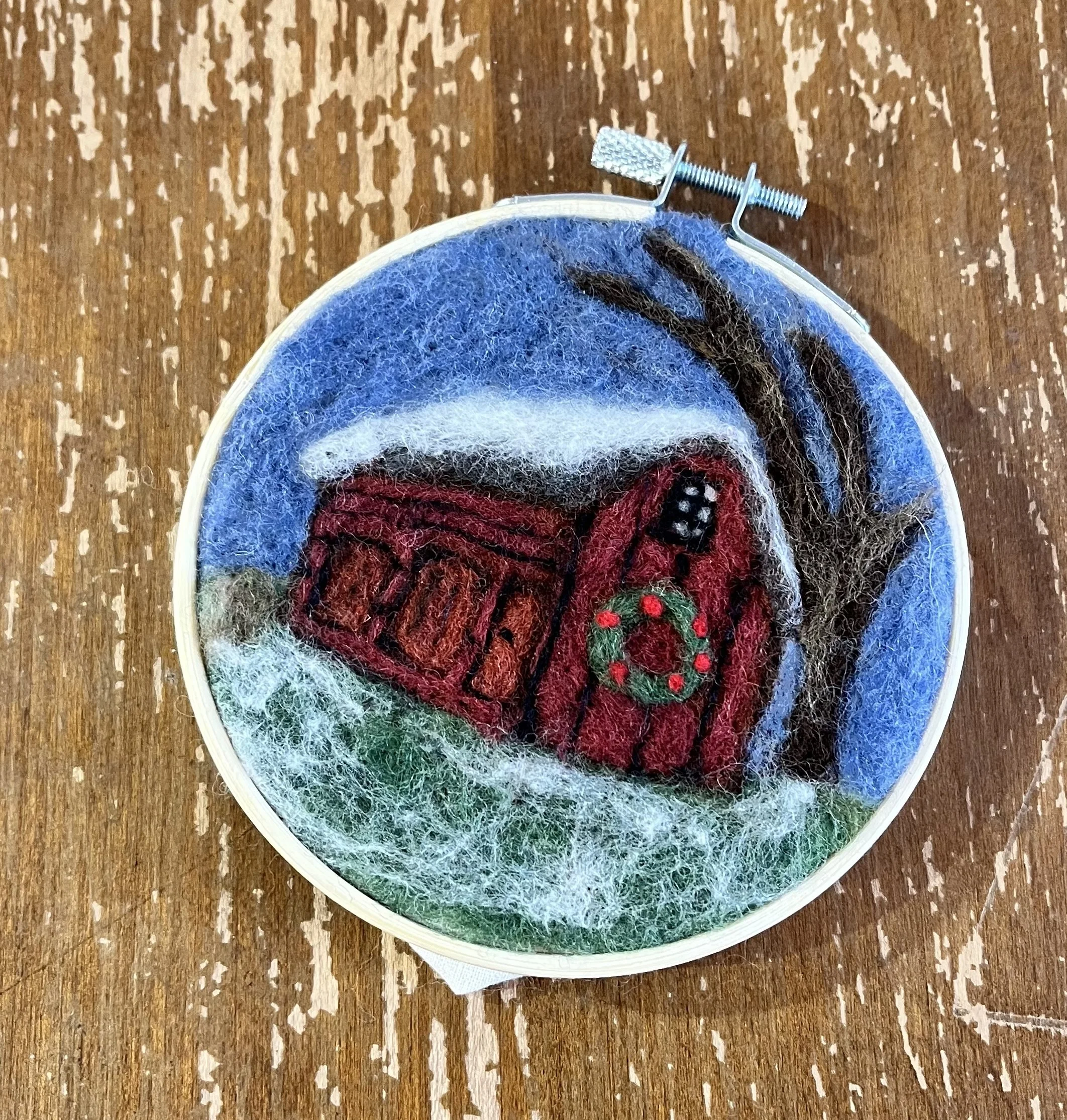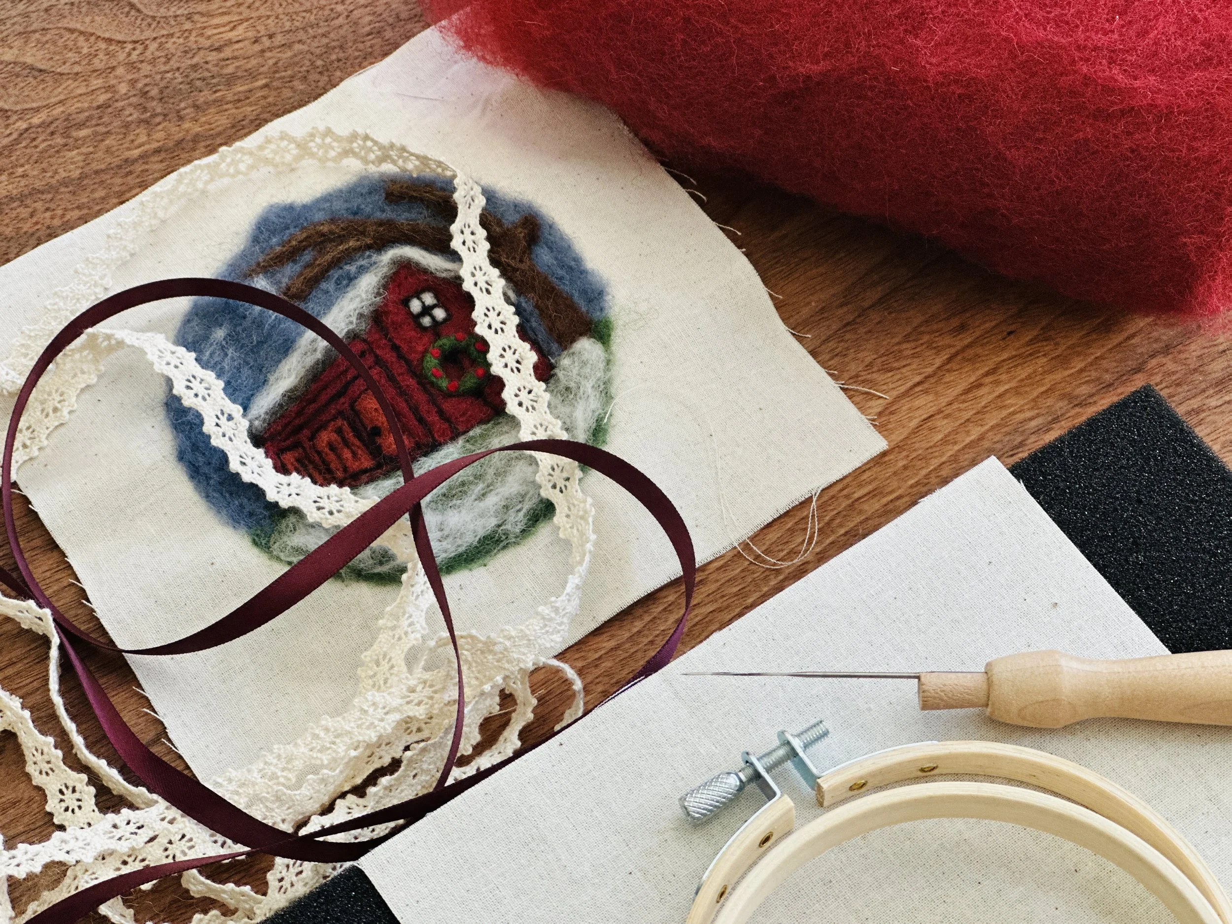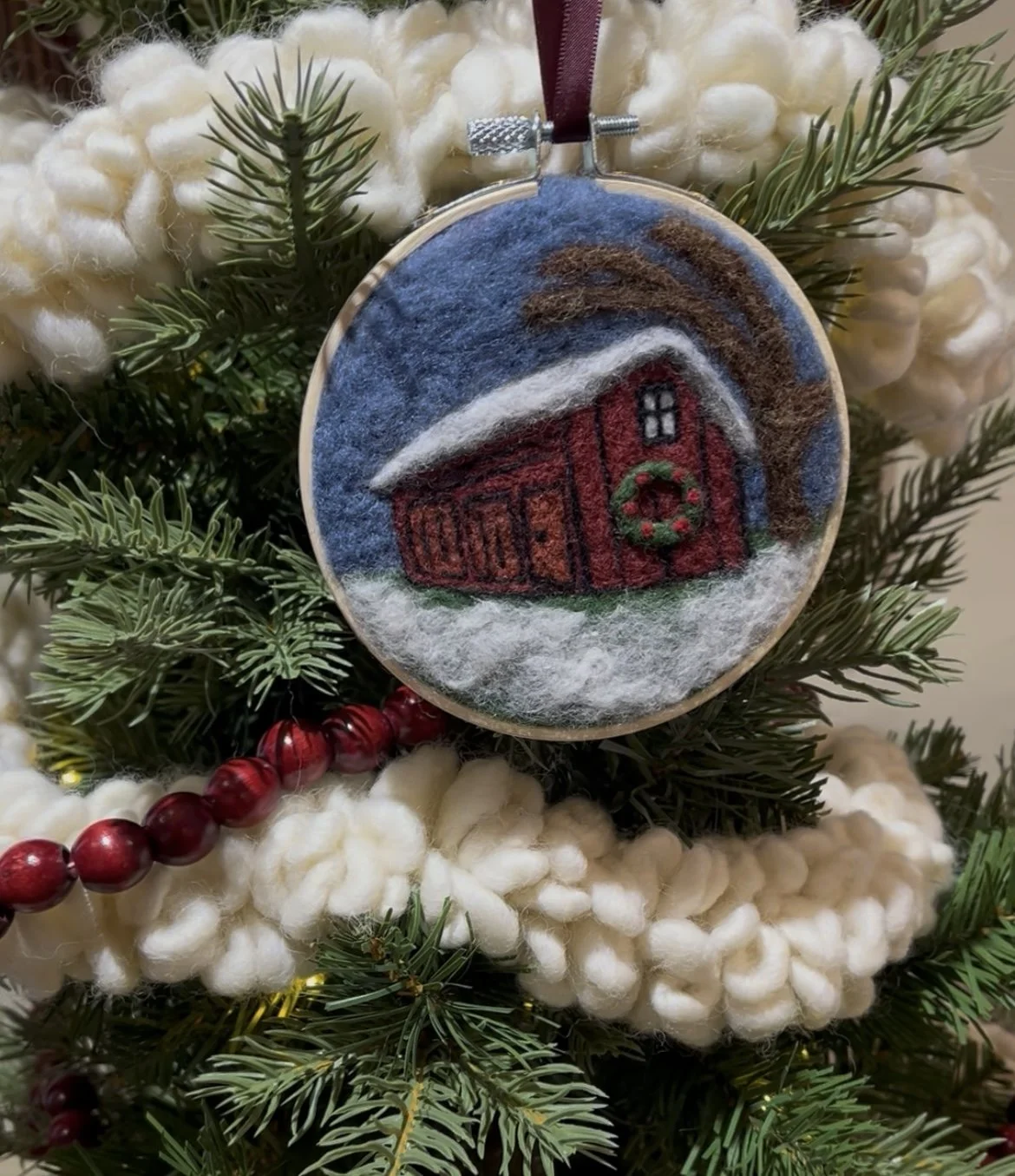 TORINO: I am using needle felting for the ornaments. It takes over an hour to create an ornament and to do the framing. With needle felting you can make flat pictures or 3D ornaments. There is a special felting needle that has little barbs at the end and when you pull the needle in and out of the wool it interlocks the fibers together to create a solid piece.
