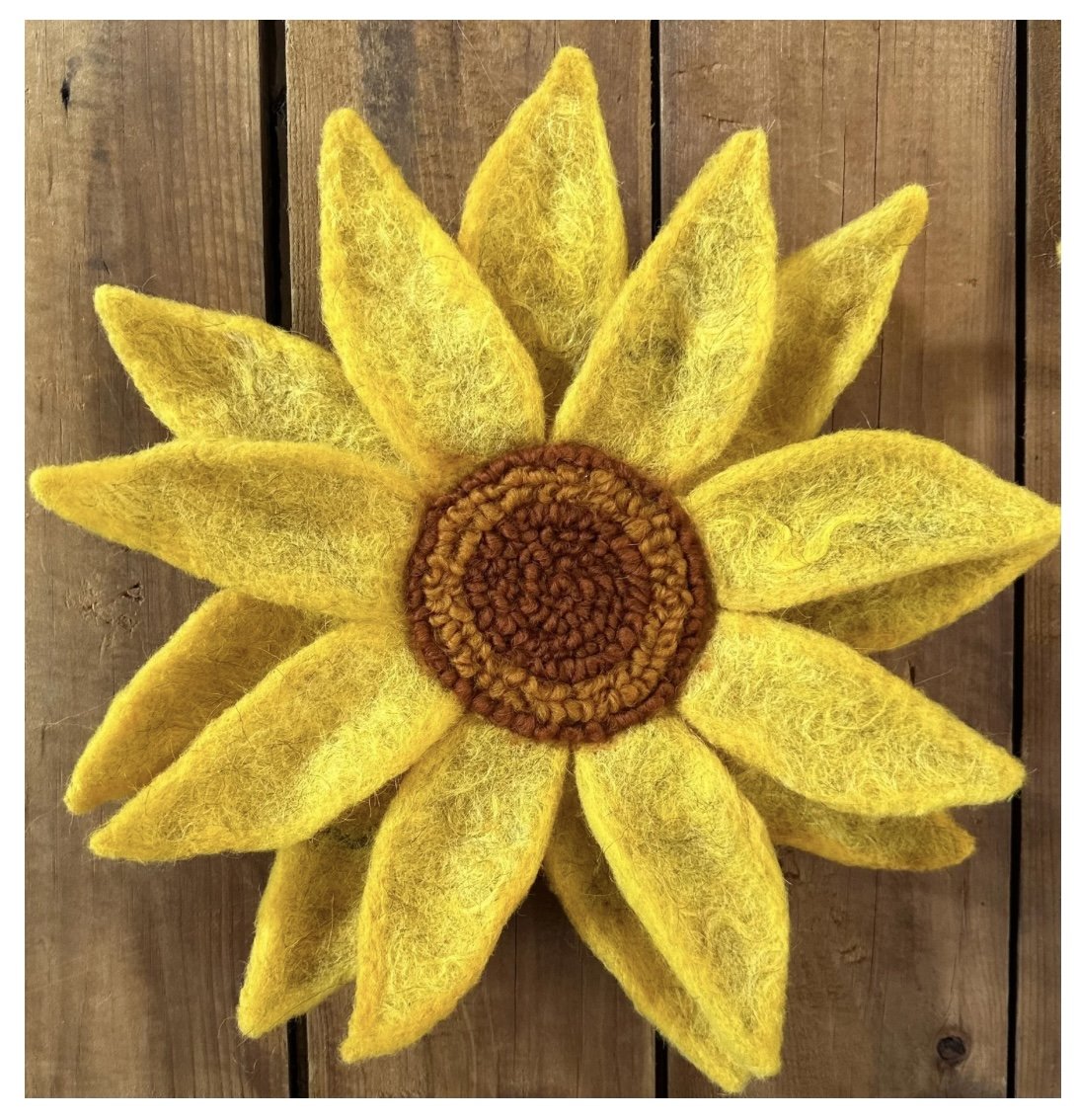 Sunflower, 2024 Wet felted Karakul Sheep Fiber, Merino Wool, Gulf Coast Wool, 13.5” × 13.5” × 2”