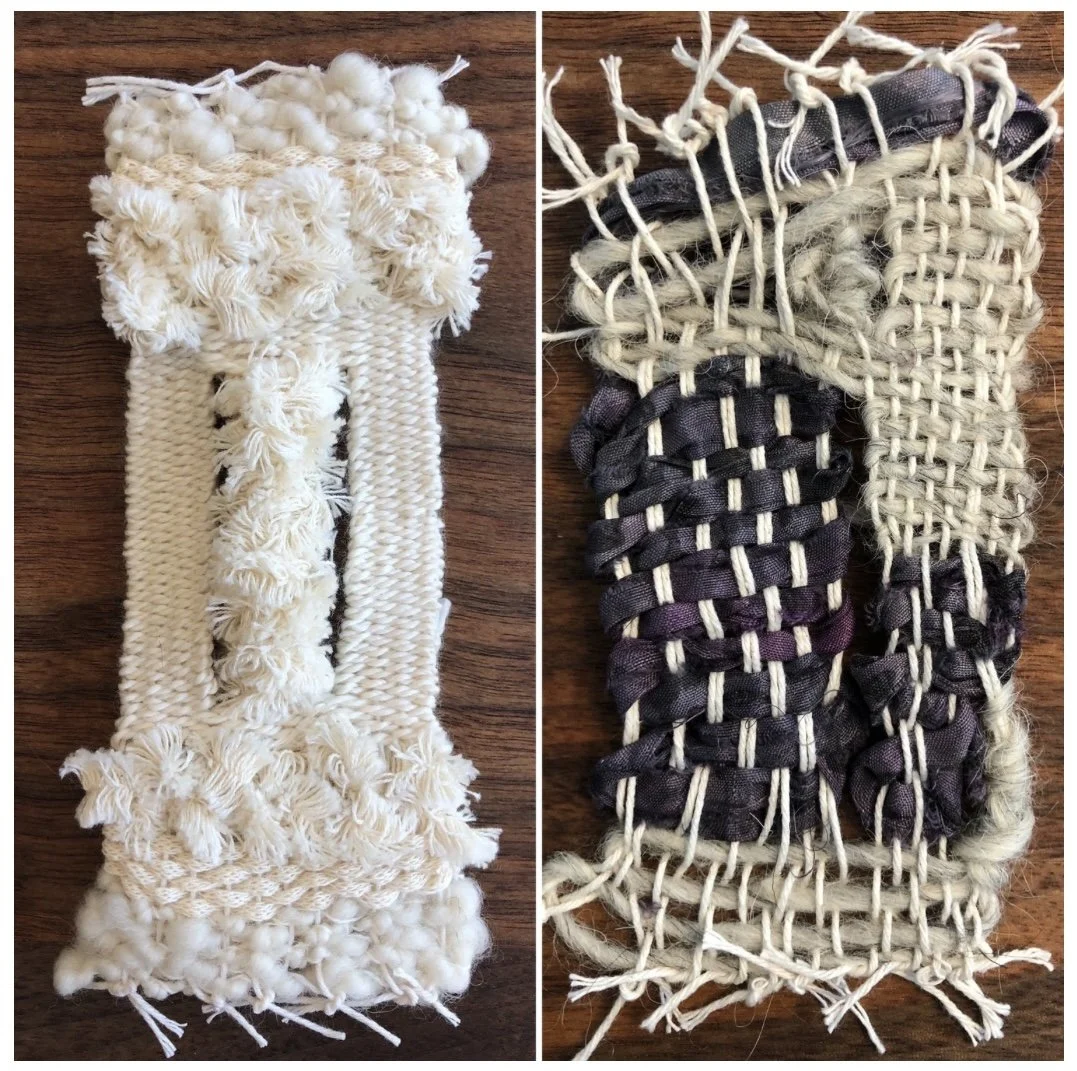 Mini Messy Weavings, 2020. Cotton thread and recycled sari silk, Left 2.5” x6” Right 2.5” x 4.5”