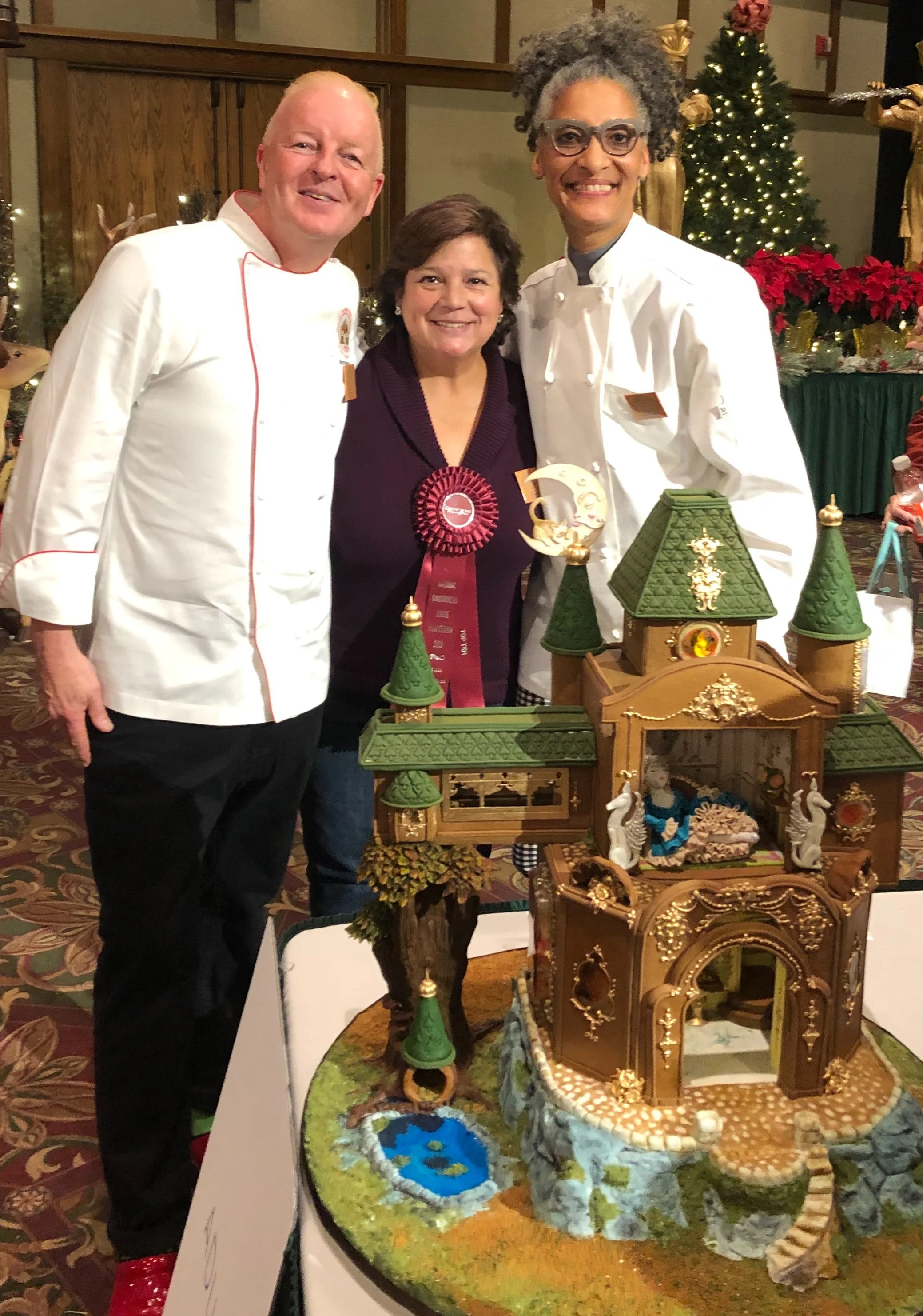 GREELEY : The gingerbread house I made for a national competition at the Omni Grove Park Inn in Asheville, NC took me about 600 hours. Those hours paid off though, because I landed in the top 10 in my first Nationals (and it was Food Network!). I learned a lot by entering the competition. The gingerbread crowd takes these competitions seriously. They are a tight knit community. I got humbled very quickly and I learned a lot from the experience. About the process, first I sketch the house. I get my inspiration for my design from artwork by Daniel Merriam. He’s an amazing artist. After I draw the house then I put it on a foam core board and assemble it. I look for any technical errors and I fix them. There’s a lot of thought going into the design. I also get help and advice from Beatriz Muller. She’s my friend, mentor and an award-winning gingerbread master. Another friend who I pick her brain with structural questions is Gloria Baca. She’s an architect. They are both essential to my gingerbread projects.